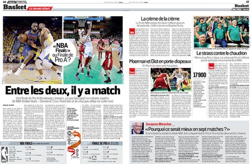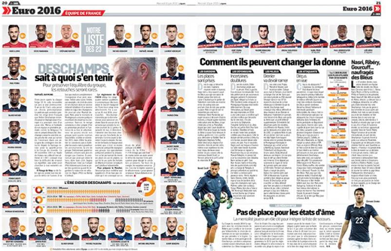 Las páginas interiores de L’Équipe siempre han tenido un diseño meticuloso, muy europeo: uno que nunca se excede ni cae en el desorden, como ocurre con muchas publicaciones con el paso del tiempo tras un rediseño o un cambio de estilo. Hay un máximo de seis columnas, con la opción de inserciones, columnas informativas y recuadros. Los títulos y subtítulos siguen una jerarquía bien definida, y los recuadros de colores ayudan al lector a comprender cómo está estructurada y ordenada la información.