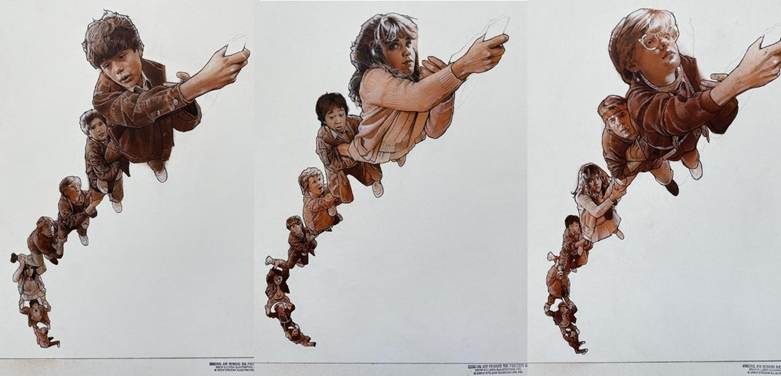 Un dato curioso: cuando vieron el póster original, los jóvenes actores se quejaron de que solo Brand aparecía en primer plano, mientras que el resto de los personajes se hacían cada vez más pequeños. Así que Spielberg le pidió a Struzan que dibujara siete versiones diferentes de la escena, cambiando el orden de los personajes cada vez para que cada miembro del reparto tuviera su momento de protagonismo.