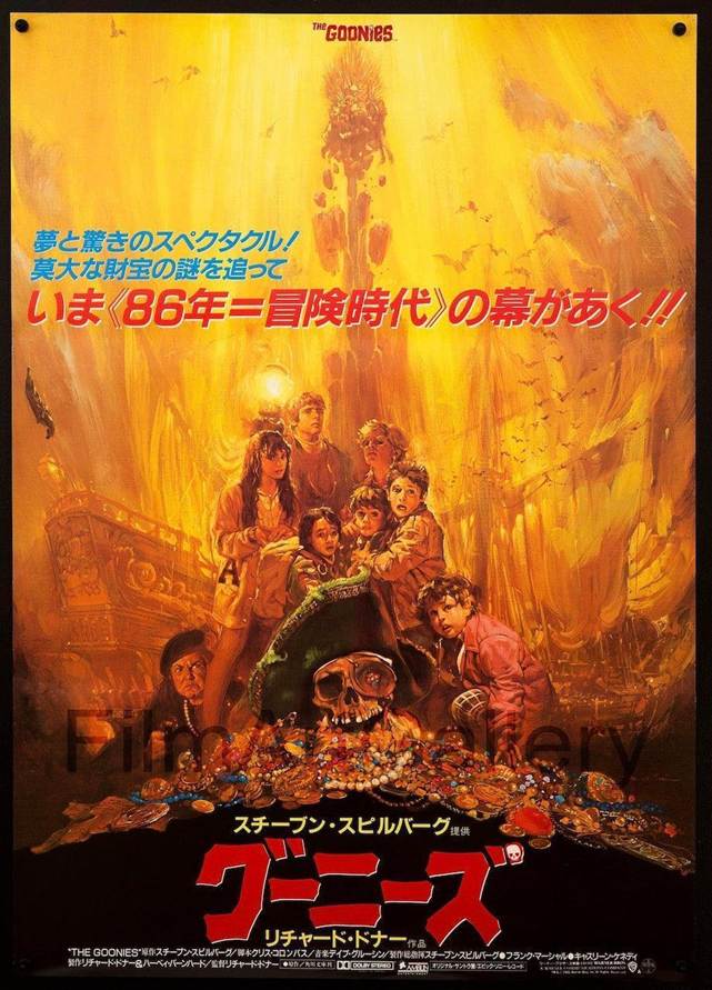 El cartel japonés de Los Goonies utiliza una ilustración de Noriyoshi Ohrai, famoso por haber dibujado el cartel internacional de El Imperio Contraataca, uno de los capítulos de la saga Star Wars, y muchos carteles de Godzilla [puedes encontrar nuestra selección de los mejores carteles de la franquicia de películas del monstruo japonés aquí].