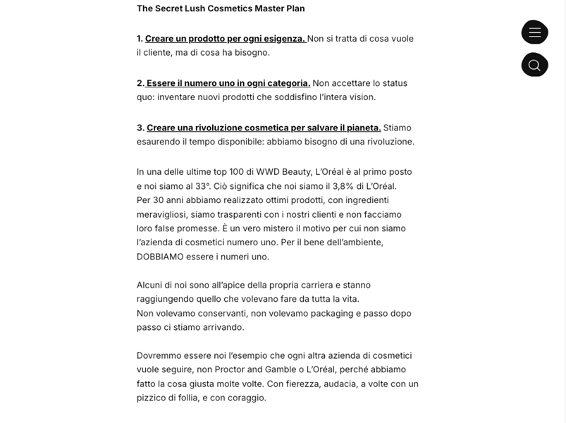 La sintaxis y el ritmo también contribuyen a construir la identidad verbal, como lo demuestran los dos ejemplos siguientes. Para comunicar su plan de negocios, Lush opta por un estilo directo y coloquial: oraciones con un ritmo rápido y un tono asertivo se alternan con oraciones más largas y descriptivas. La sintaxis simplificada favorece las oraciones coordinadas sobre las subordinadas, alejándose del lenguaje empresarial formal y del tono institucional adoptados por la mayoría de las empresas.