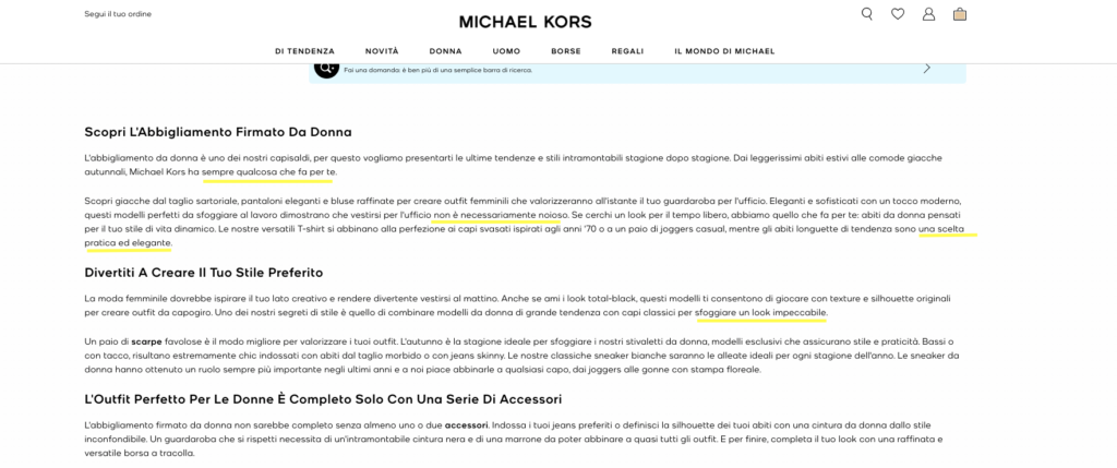 Por el contrario, si lo que una empresa «dice» no coincide con lo que «muestra» visualmente, el público percibirá una falta de coherencia y podría perder la confianza en la marca. Consideremos un sitio web con imágenes y gráficos refinados, pero acompañado de un texto descuidado o excesivamente coloquial: esta falta de coherencia confundiría a los consumidores, poniendo en duda la credibilidad de la marca. El sitio web de la marca de moda Michael Kors es un buen ejemplo: por un lado, el estilo visual glamuroso con fotografías brillantes promete una experiencia de lujo; por otro, el estilo de comunicación excesivamente comercial y estereotipado da la impresión de haber llegado al sitio web de comercio electrónico de una marca de bajo coste.