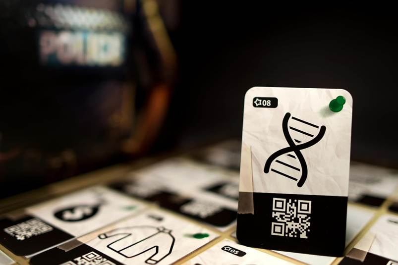 - Escaneo de códigos QR: no hay dados ni manuales que leer; cada carta (personaje, ubicación o prueba) tiene un código QR que, al escanearlo con la aplicación, permite buscar pistas, desplazarse, interrogar a sospechosos o solicitar el análisis de pruebas por parte de la policía científica. Por lo tanto, la aplicación define el contexto narrativo en tiempo real. Por ejemplo, escanear la carta «científico» podría revelar un testigo asustado, o que el científico podría tener malas intenciones.