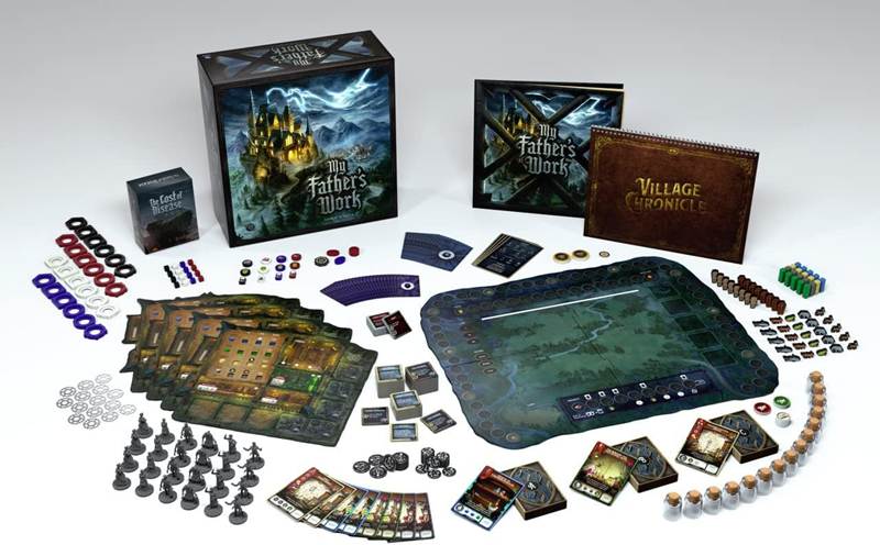 Cerramos esta reseña con un título caracterizado por la suntuosidad de la producción: My Father’s Work. Es un juego competitivo para 2-4 jugadores, con una duración considerable de aproximadamente 3 horas por partida.