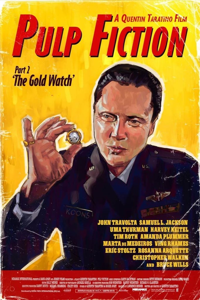 La historia de un reloj transmitido de padres a hijos mediante métodos poco convencionales (y que repercutirá en la trama de la película) se narra en este póster creado por un fan. También aparece un personaje secundario: el padre del boxeador Butch, interpretado por Christopher Walken.