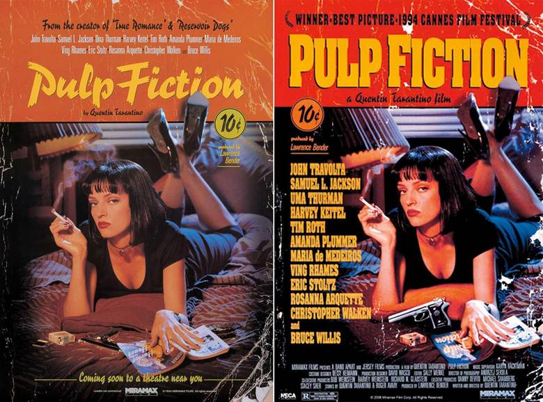 Si te fijas bien en los dos carteles oficiales de Pulp Fiction de 1994, hay tres detalles diferentes: el título del libro, la marca de cigarrillos y la posición de la pistola.