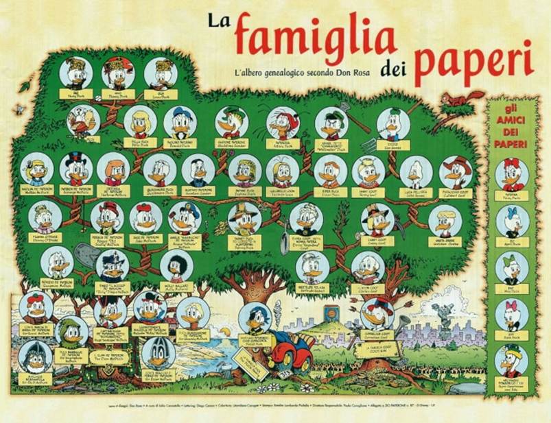 Don Rosa también llega al extremo de crear y dibujar el árbol genealógico de los patos, que representa todos los linajes del mundo de los patos de Disney.