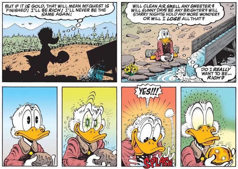 Así trabaja Don Rosa: toma incluso obras «desconectadas» de Barks, combinándolas para continuar sus historias, proporcionando así mayor profundidad a los acontecimientos y personajes.