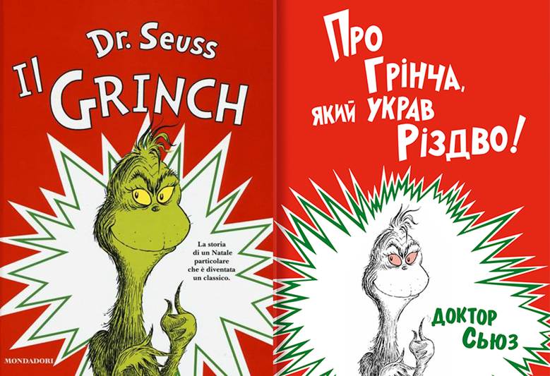 Pero la primera portada de ¡Cómo el Grinch robó la Navidad! sigue siendo la más popular, incluso entre las ediciones internacionales. Aquí tienes, por ejemplo, una versión italiana y una ucraniana; si te fijas bien, verás que el Grinch es verde en la primera, pero no en la segunda. ¿Cuál prefieres?