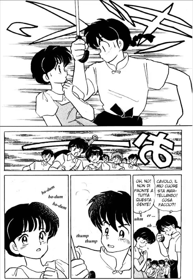 Se trata de una historia ambientada en el mundo del kung fu que retoma el caos coral de Lamu, pero que parte de una premisa aún más llamativa. La historia se centra en Ranma Saotome, un experto en artes marciales que, tras caer en un manantial maldito en China, se transforma en chica cada vez que se moja con agua fría, volviendo a convertirse en chico al mojarse con agua caliente. Su padre, maestro de artes marciales, sufre la misma maldición, solo que en su caso, al entrar en contacto con el agua, se transforma en panda.