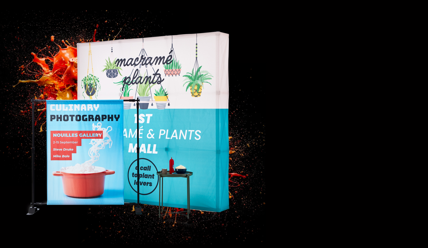 - Marcos con tela tensada: de pared, de pie o retroiluminables, son fáciles de montar y con ellos se consigue un efecto impactante. La tela tensada a medida se puede imprimir y cambiar según las ocasiones.