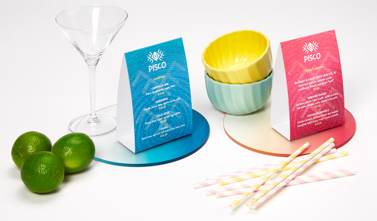 - Carteles de sobremesa: en estos carteles puedes proponer tu menú del día o información sobre platos específicos en la mesa o en estanterías; tienes 5 formatos disponibles con tamaños que van de 10 × 5 × 4 cm a 17 × 19 × 5 cm, están realizados en cartón SBS de 380 g y se les pueden aplicar plastificado, mate o brillante, o algún acabado exclusivo como barniz 3D, laminado dorado y laminado plateado.