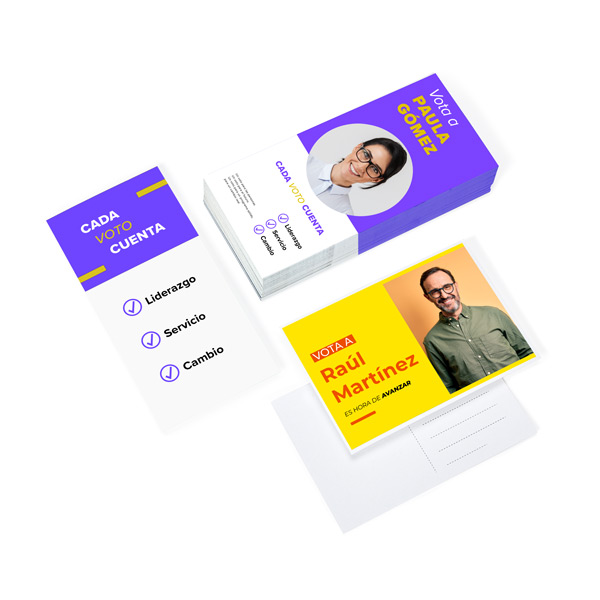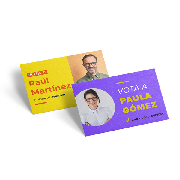 Tamaño reducido y ligereza para una comunicación «de bolsillo». Las Tarjetas de propaganda electoral se pueden entregar fácilmente en cualquier contexto y, si les das un aspecto atractivo, constituyen una comunicación de éxito.