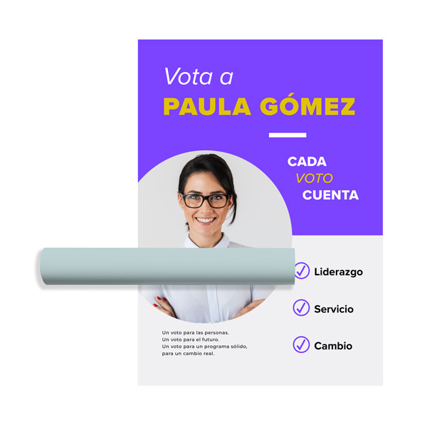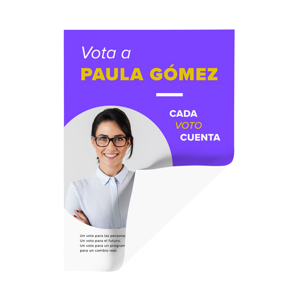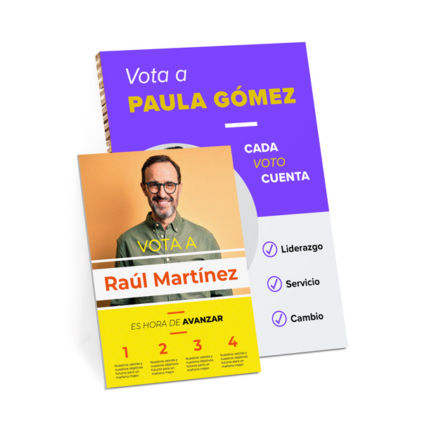 Si el objetivo de las Tarjetas de propaganda electoral es que los electores las guarden en el bolsillo o en la cartera, el de los Carteles electorales es conseguir dar la máxima visibilidad a los mensajes políticos del candidato. Por este motivo, ponemos a tu disposición muchísimos medios para crear tus Carteles electorales; podrás imprimir carteles de todos los tamaños y materiales para transmitir tu mensaje de la forma que tú elijas.