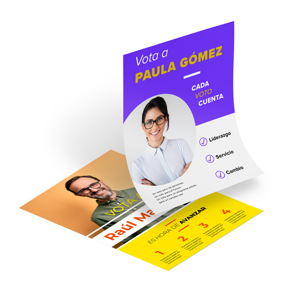 ¿Estás organizando tu próxima campaña electoral? Con Pixartprinting puedes imprimir todo el material electoral necesario para hacer realidad tu publicidad electoral al margen de internet: Tarjetas de propaganda electoral, Carteles electorales, Banderas, Folletos y muchísimos más productos. Puedes hacerlo fácil y rápidamente en nuestro sitio web, aprovechando nuestros precios inigualables y las numerosas opciones de personalización que te ofrecemos.